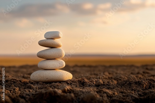 Fototapeta premium Balanced Stone Cairn on Soil with Tranquil Sunset Background