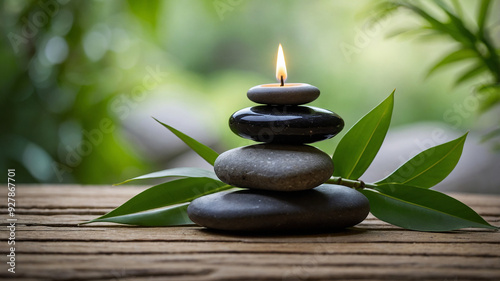 Obraz premium Balanced stones and a lit candle with green leaves in a calming natural Zen...