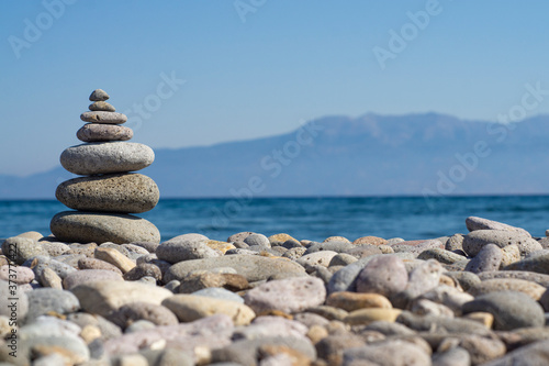 Fototapeta premium Balanced stones on a pebble beach during sunset