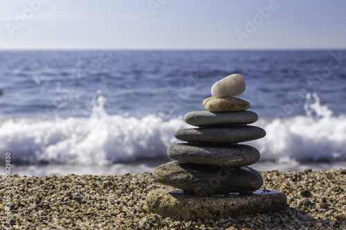 © DMITRIY, Fototapeta premium Balanced stones on the beach of Sardinia Island. Waves background.