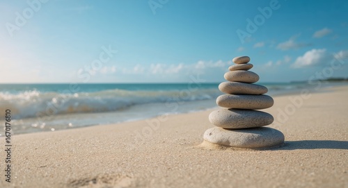 Fototapeta premium Balanced Stones, Serene Beach. A ZenInspired Still Life, Calming Colors,...