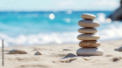 Fototapeta premium Balanced stones stacked on sandy beach with serene ocean backdrop