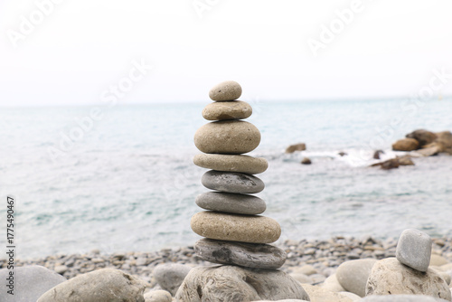 Fototapeta premium Balanced stones stacked on the beach with calm sea background, symbolizing...