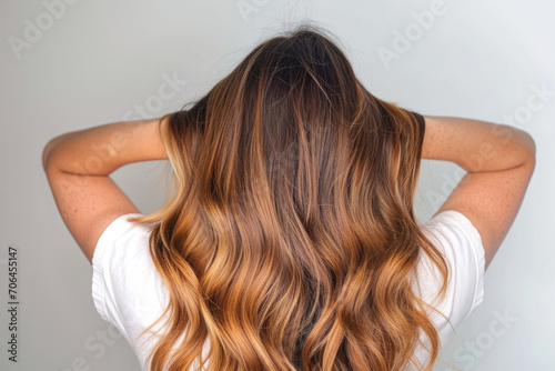 © Anastasiia, Fototapeta premium Balayage Hair Displayed By Woman Against White Background