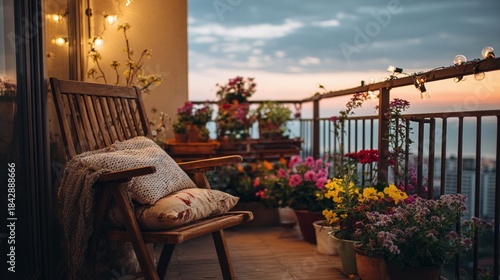 © Oleksandr, Obraz premium Balcony bliss at sunset. A cozy wooden chair with pillows invites relaxation amidst vibrant flower pots and soft, ambient string lights, creating an enchanting outdoor space.