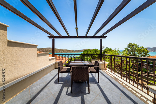 © Maksym, Fototapeta premium Balcony or terrace with outdoor furniture under wooden beams meant for roof, overlooking garden and sea view. Space combines comfort and natural beauty. Perfect for relaxation and enjoying.