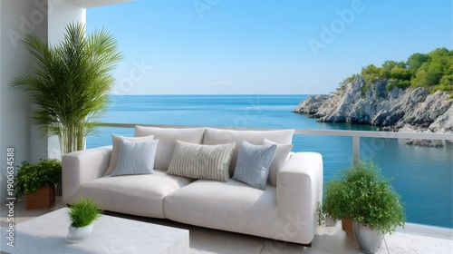 Obraz premium Balcony sofa overlooking Mediterranean sea and coastal cliffs