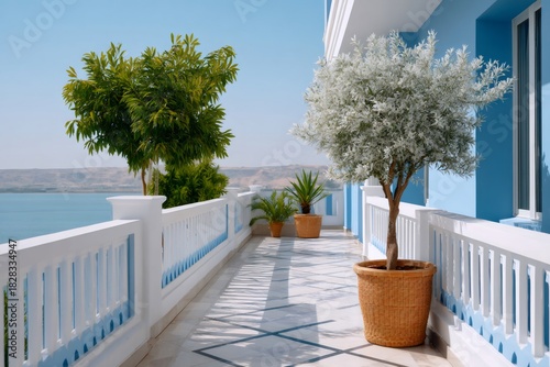 Obraz premium Balcony terrace with potted trees by the sea