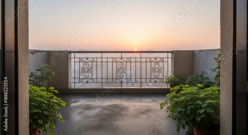 Fototapeta premium Balcony view at sunset with plants and metal fence.