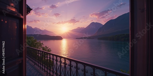 Fototapeta premium Balcony view of a mountain and lake scene during sunset, highlighting outdoor...