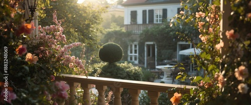 Obraz premium Balcony view of a romantic morning with a garden backdrop