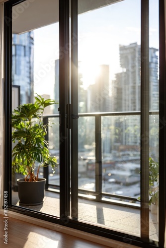 Naklejka premium Balcony View with Plant and Cityscape in the Background.