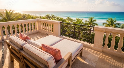 © Dece Std, Fototapeta premium Balcony with sunbeds overlooks the ocean; palm trees in view, sunny