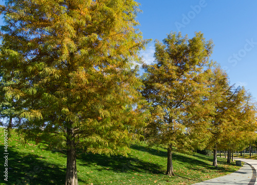 © MarinoDenisenko, Fototapeta premium Bald Cypress Taxodium Distichum (swamp, white-cypress, gulf or tidewater red cypress) tree in public landscape city Park Krasnodar or Galitsky park in autumn 2021. Foliage has acquired autumn color