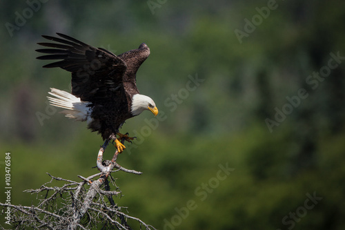 © Amanda Mortimer, Naklejka premium Bald Eagle - A bald eagle lands in a tree above Brooks Falls, Katmai National Park