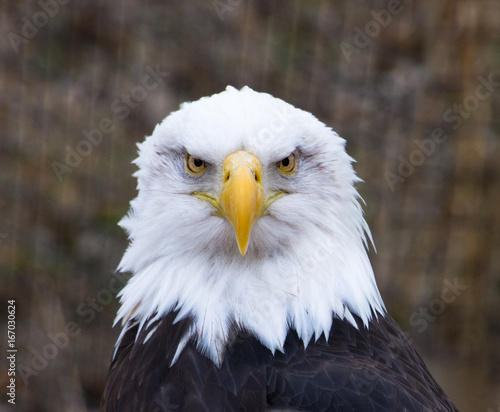 Obraz premium Bald Eagle Facing Forward with its intense eyes looking into the camera.