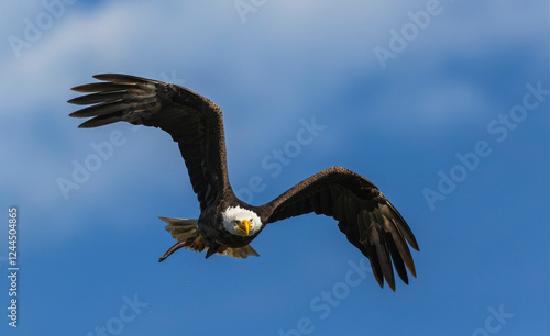 © Danita Delimont, Naklejka premium Bald eagle flyby with a meal, Washington State, USA.