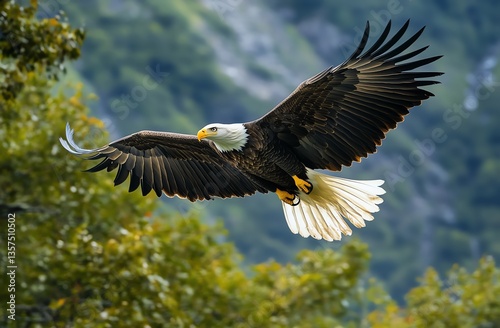 Naklejka premium Bald Eagle Flying Gracefully Over Green Forest and Mountain Landscape