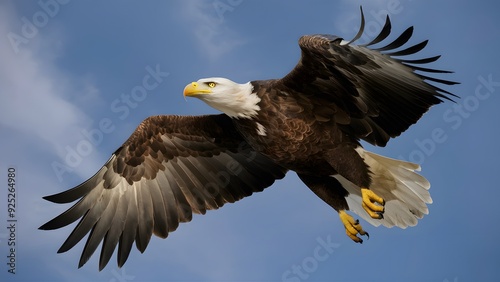 Fototapeta premium Bald Eagle Flying in Blue Sky, Real Photo, Pattern Background, Wallpaper,...