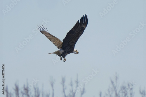 Obraz premium bald eagle flying with wings spread has caught a fish