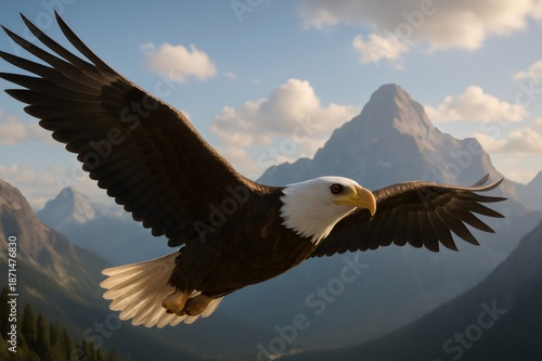 © Татьяна Евдокимова, Obraz premium Bald eagle flying with wings spread, symbolizing freedom and strength, above rugged mountains, valleys, and forests under a blue sky