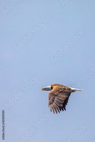 Obraz premium Bald Eagle (Haliaeetus leucocephalus) adult, flying in a blue sky with copy...