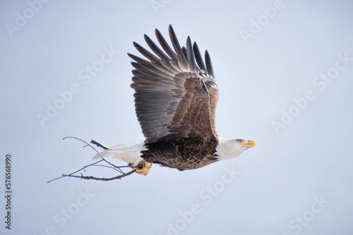 Fototapeta premium Bald eagle (Haliaeetus leucocephalus) in flight with blue background