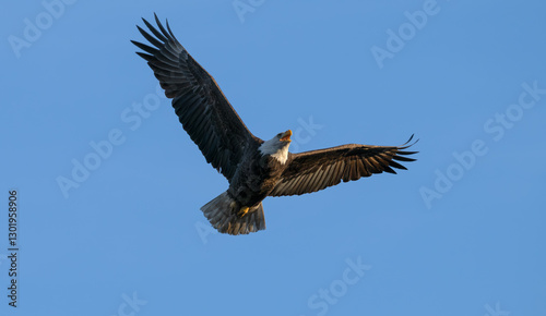 © Lecia Michelle, Obraz premium Bald eagle in flight against a blue sky.