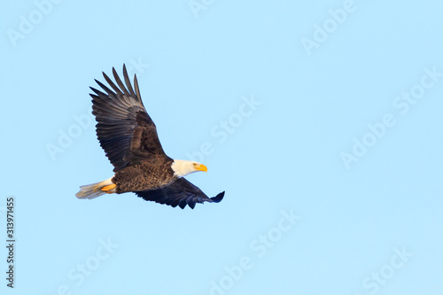 © Don Mroczkowski, Obraz premium bald eagle in flight, bird on blue background