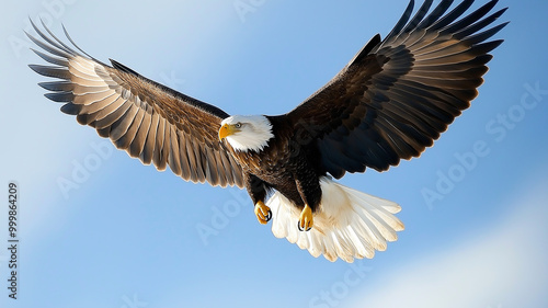 Fototapeta premium Bald Eagle in Flight, Capture a bald eagle soaring against a clear blue sky