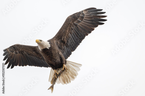 © Lecia Michelle, Fototapeta premium Bald eagle in flight carrying a fish in its talons.