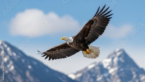 © AudaX, Obraz premium Bald eagle in flight with a mountain landscape.