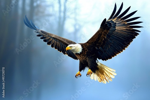 © talkative.studio, Obraz premium Bald Eagle in Flight with Blurred Forest Background