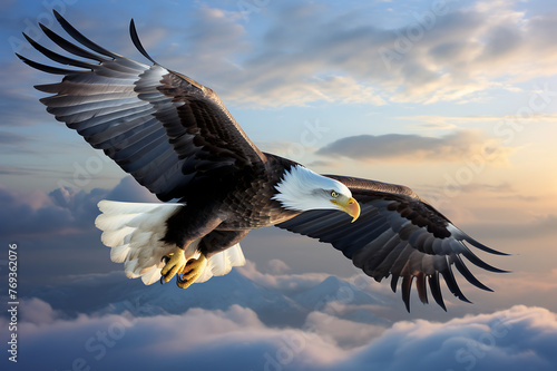 © Creative Laik, Obraz premium Bald Eagle in flight with mountain background. 3D illustration.