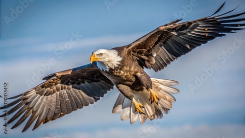 Fototapeta premium Bald Eagle in Flight with Spread Wings Against a Blue Sky