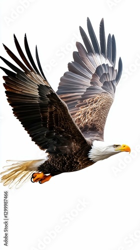 © Aofintarapak, Fototapeta premium Bald Eagle in Full Flight Displaying Powerful Wings and Feathers on a Bright White Background Illustration