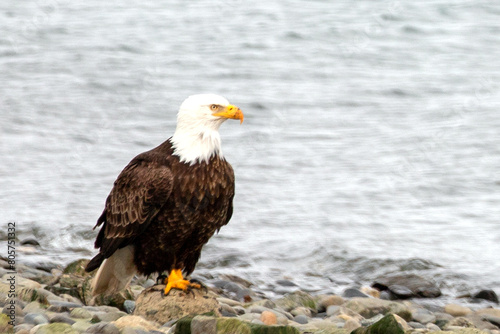 Obraz premium Bald eagle on rocky beach on Homer Spit Alaska United States