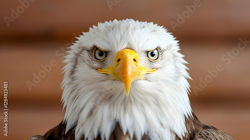 © Bella, Fototapeta premium Bald eagle portrait, intense gaze, wooden background, wildlife