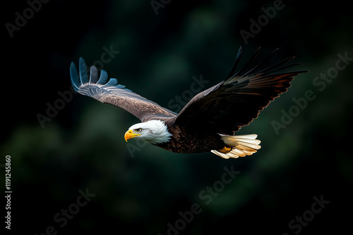 © Pixel World Vision , Fototapeta premium Bald eagle soaring gracefully in a clear blue sky during the warm hours of midday over a serene landscape