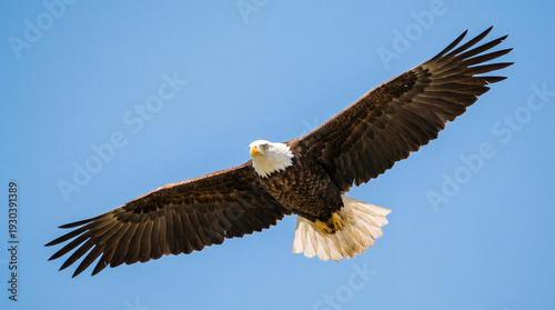 © GeniusMinus, Obraz premium Bald Eagle Soaring High Against Clear Blue Sky