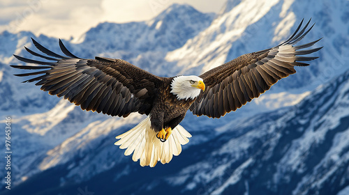 Naklejka premium Bald eagle soaring in front of snow-capped mountains