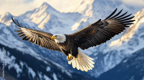 Obraz premium Bald eagle soaring in front of snow-capped mountains