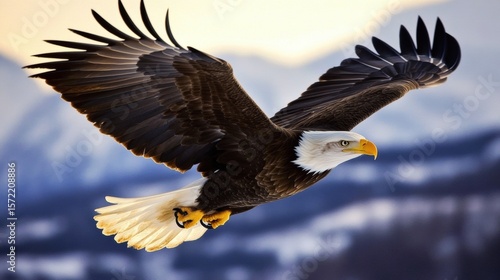 © Wannaeka, Obraz premium Bald Eagle Soaring in Mountainous Landscape at Sunrise/Sunset, Dramatic and Majestic over