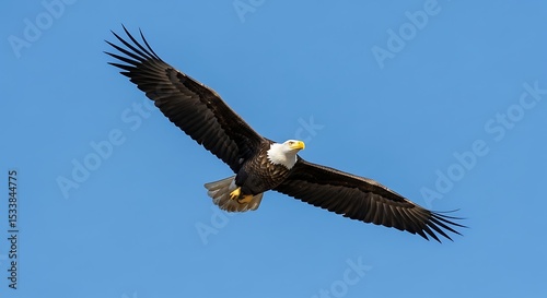 © Panuluh, Fototapeta premium Bald Eagle Soaring in the Sky, Majestic Flight, American Symbol, National Bird, Wildlife Photography, Crisp Detail, Feathers Displayed, Power and Freedom, Clear Blue Sky, Serene Beauty