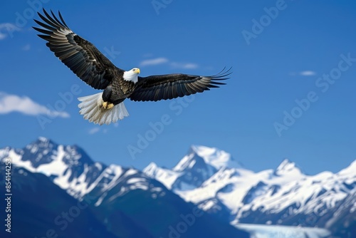 Naklejka premium Bald Eagle Soaring Over Snow Capped Mountains.