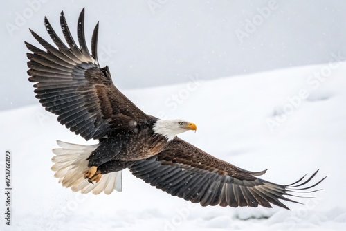 Obraz premium Bald Eagle Soaring Over Snowy Landscape in Winter Wonderland