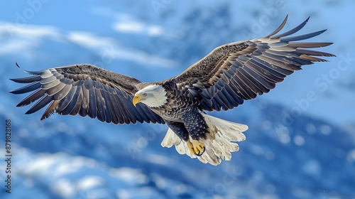© Тетяна Іванова, Naklejka premium Bald eagle soaring through a clear blue sky.