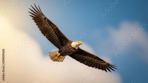© Ehtisham, Obraz premium Bald eagle soaring through a cloudy sky with golden sunlight
