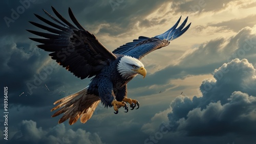 © kucret, Obraz premium Bald Eagle Soaring Through Cloudy Sky