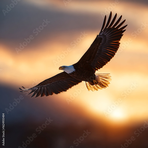 Naklejka premium Bald Eagle Soaring Through Golden Hour Skies A Symbol of Freedom and Power in...
